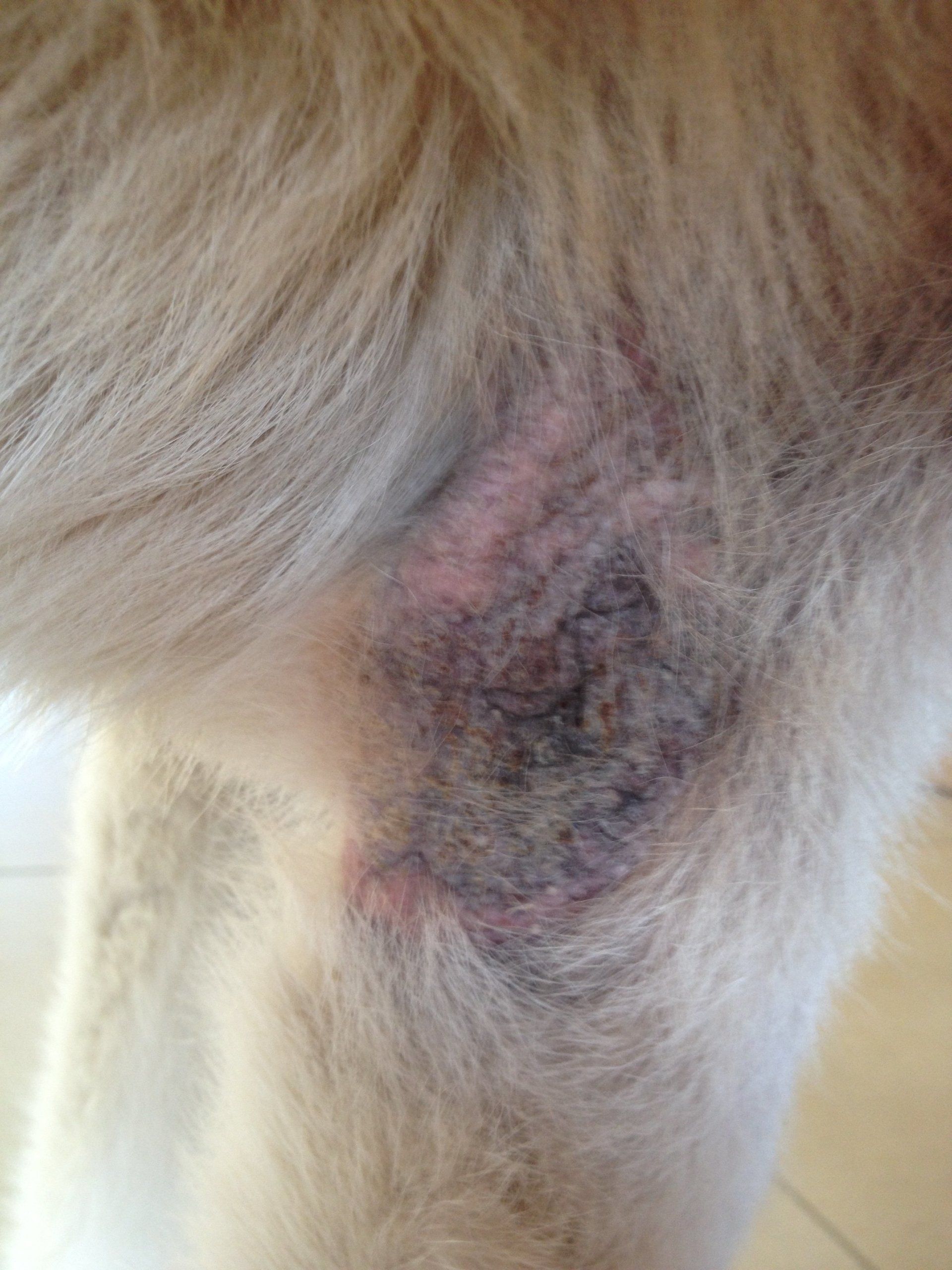 Ellbogen hat keinerlei Fell mehr, nur noch nässend und offen